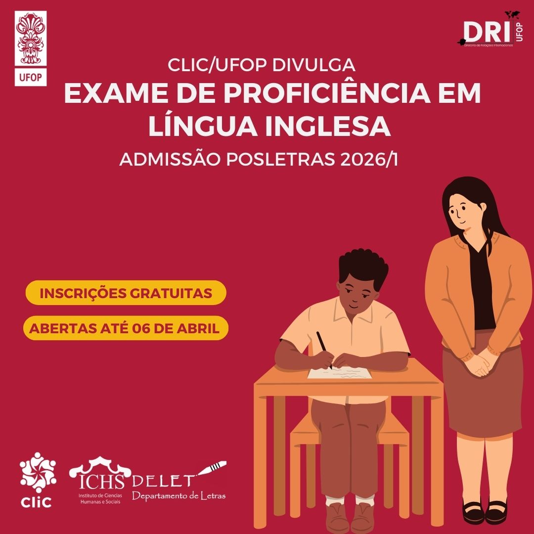 O Centro de Línguas e Culturas (CLIC/UFOP) divulga a abertura de período de inscrições para a realização de Teste de Proficiência em Língua Estrangeira - Inglês destinado exclusivamente aos candidatos aos cursos de Mestrado e Doutorado do Programa de Pós-Graduação em Letras: Estudos da Linguagem (Posletras/UFOP).