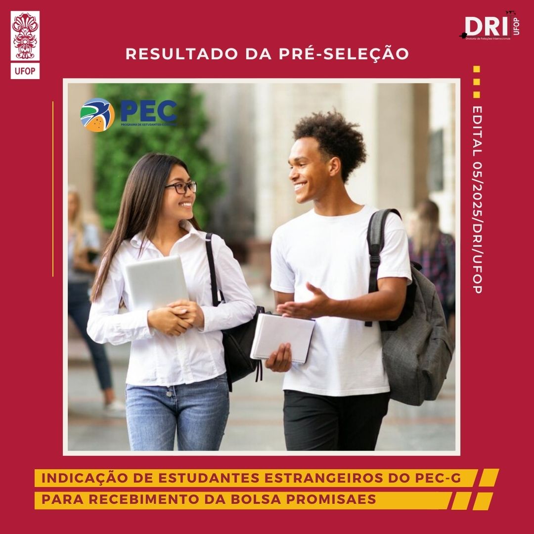 A Diretoria de Relações Internacionais (DRI) torna público o resultado da pré-seleção do Edital 22/2025/DRI/UFOP - Bolsa Mérito. Clique aqui para ter acesso ao Resultado.